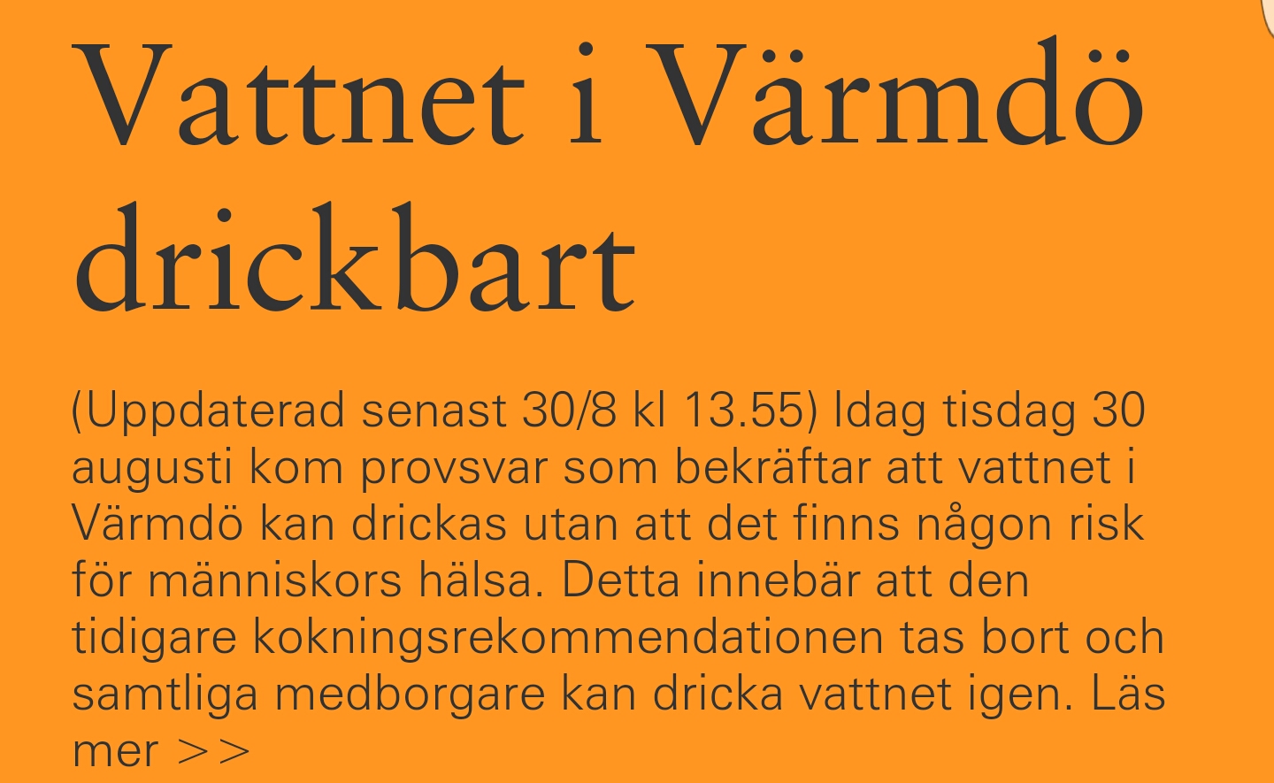 Sen får vi inte glömma det senaste, att boende i Värmdö kommun ej fått dricka av det kommunala vattnet. Larmet kom i fredags efter lunch om att dricksvattnet är otjänligt. Jag hade nog ”bara” hunnit dricka ca 2 liter vatten under dagen redan och såg framför mig hur jag skulle spendera kvällen på toaletten hemma…