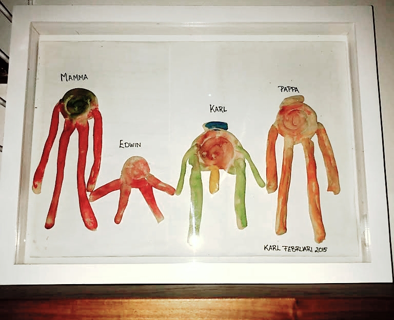 Nu var det dags för mat! En stor eloge till Johanna och hennes vän Helena som fixat massor av godsaker. Det fanns bland annat en rosa röra och ugnsbakade små potatisar med sting. Allt var jättegott, och det tog nästan 24 timmar innan min tunga som svällt upp av kryddorna tillslut krympt till normal storlek igen. Det fina med detta var att jag hade väldigt svårt att prata under middagen, vilket gjorde mig till sällskapets utan tvekan bästa lyssnare istället. Jag såg nog allvarlig ut där jag satt tyst och lyssnade, jag var inkännande och intresserade mig för vad alla hade att säga. Men när jag lyfter blicken så ser jag ett konstverk, ett konstverk av deras äldsta son Karl där han porträtterat hela sin familj.