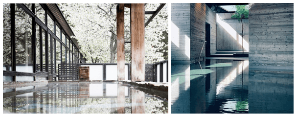 Det första man möts av när man kommer in i det japanska badet är det som kallas för Daiyokujo, det stora varmbadet med dess tillhörande huskroppar. Designen är inspirerad av kejserliga japanska innergårdar där vattenspegeln i mitten representerar innergården, vi vadade oss genom vattnet tillsammans tills vi kom fram på andra sidan. Där kunde man gå ut till det som heter Rotenburo, de varma utomhuskällorna och här kunde man ligga i det varma vattnet medan några små snöflingor yrde förbi ansiktet. De hade en något som kallades en tyst halvtimme där när vi kom ut så alla låg tysta i vattnet…
