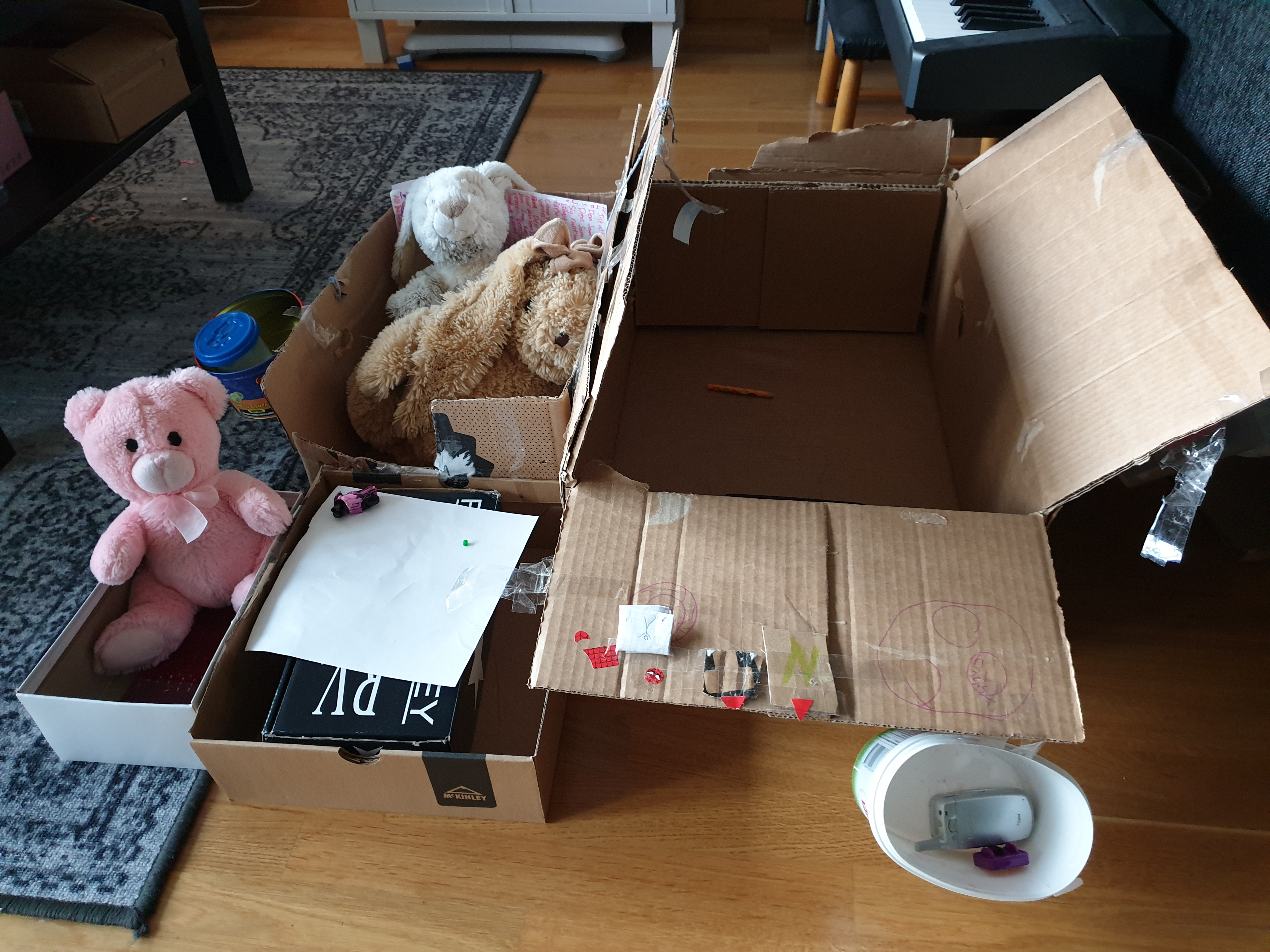 Ja okej då, de läste väldigt lite! Freja både skriver och läser en hel del själv, så det var egentligen bara twinsen man fick sitta och öva lite läsning med under lovet. Vi fick även besök av min syster en dag och lilla Elton, så då blev det ju en hel del lek förstås. Och fika! Annars så höll vi oss mest inomhus faktiskt, barnen tyckte det var för kallt utomhus och det var ju till och med minusgrader ute vissa dagar! Så våra planer på att vandra runt i Tyrestaby bland skogar och djuren på bondgården sprack ju, de ville inte gå ut på grund av kylan. Inte ens när jag föreslog att vi kunde åka till äventyrsparken ville de följa med, så vi pysslade en hel del hemma istället. De fick alla mina tomma kartonger jag hade hemma och byggde av dessa en agentbil, den blev superhäftig! Men tar typ upp all ledig plats på golvet, så där står den nu och breder ut sig…