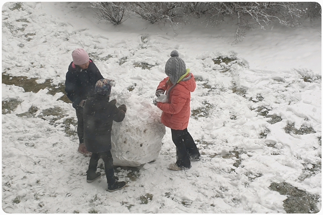 Det kom ju lite snö under några dagar på lovet, vilket möttes av barnens höga jubel. De ville genast ut och rulla ihop en gigantisk snöboll. På bilden hade de bara börjat, sedan rullade de upp all snö som fanns på baksidan och placerade det gigantiska klotet bredvid huset så att alla grannarna kunde beskåda underverket. Det tog tre extra dagar för snöbollen att smälta bort efter att all annan snö försvunnit. Så välrullad var den!