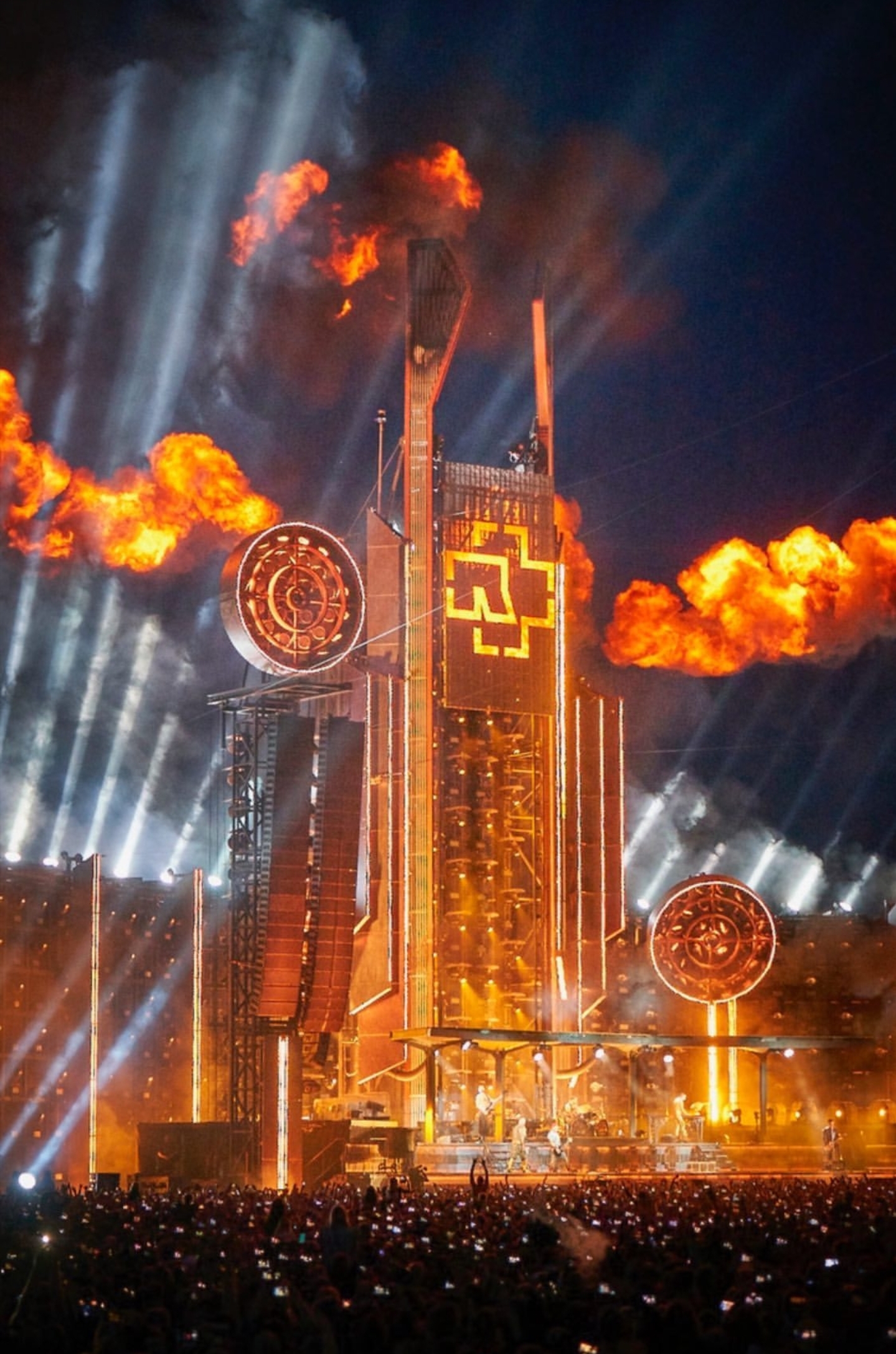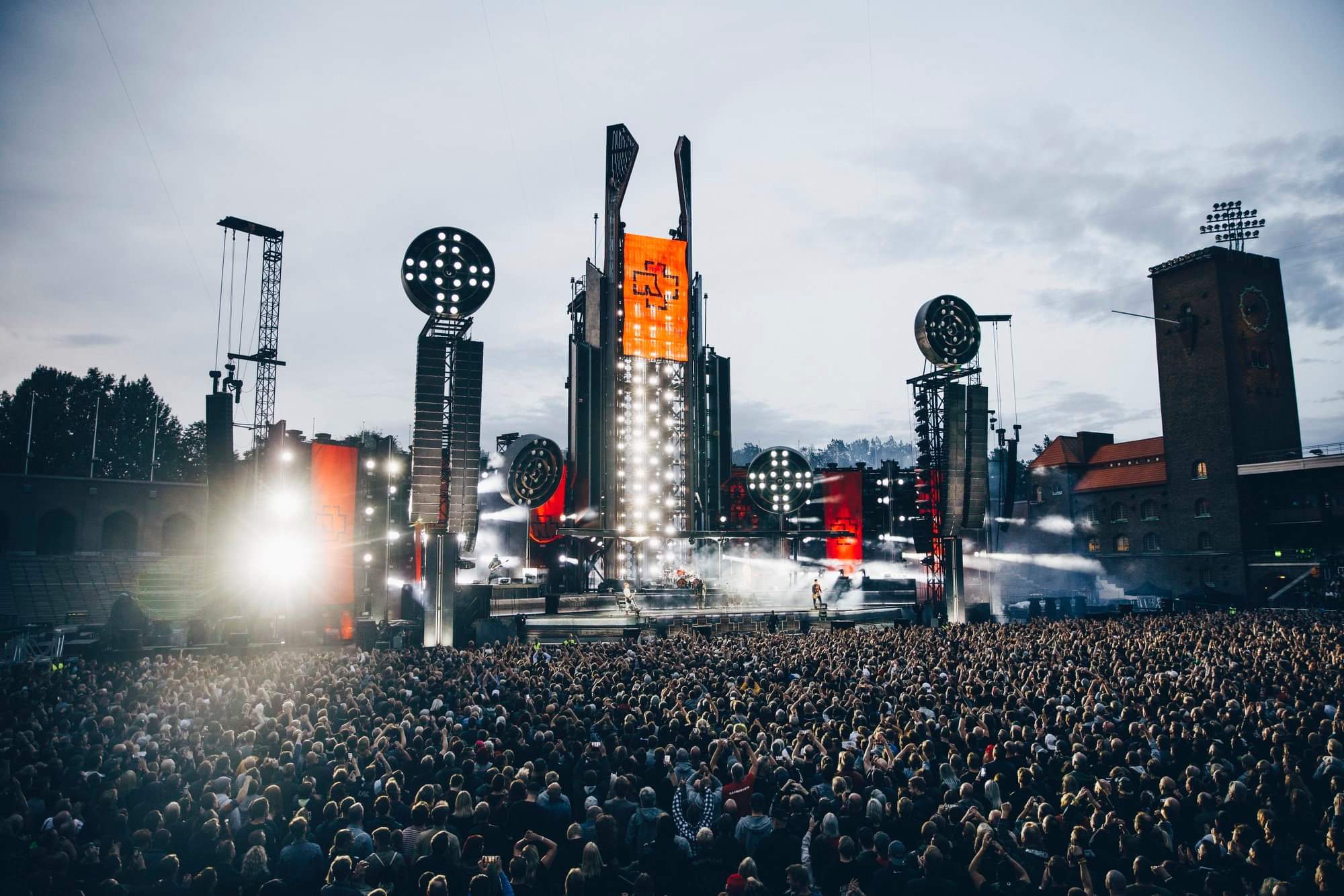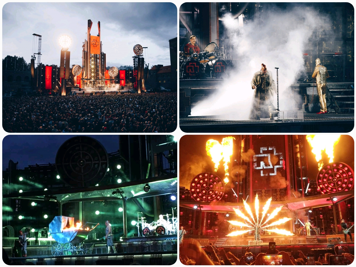 På denna konsert hade jag med mig Tommy, Marcus, Mogge och Jocke som alla fick uppleva en afton vi sent ska glömma. När Konserten startade hissades Rammsteins logga upp i det stora tornet mitt på scenen till trumpeternas fanfar, sedan dök trummisen upp bakom sitt trumset och tog emot publikens jubel. Därefter slog han hårt på sin stora trumma och en synkroniserad explosion hördes över hela scenen där detonationer exploderade till sprakande eldgnistor. Sedan kom bandmedlemmarna in en efter en på scenen med sina instrument till tonerna av Was Ich Liebe, och avslutningsvis kom även sångaren Till Lindeman upp på scenen och tog emot hela publikens kärlek och höga jubel. Han har kanske aldrig varit en skönsångare på något vis, men hans mörka röst och texter på tyska gör sig otroligt bra ihop med deras industriella rockmusik. Allt är bättre live med detta band, hans känsliga sångröst och bandets maffiga riff och dundrande trummor överträffar det mesta. Tempot genom hela konserten är fläckfritt och på tyskt manér exakt som det ska låta. Rammstein pratar sällan mellan låtarna utan tackar snällt ibland innan de drar igång med nästa låt, så deras konserter blir väldigt intensiva och just denna konsert på Stadion blev så intim och fin om man nu kan säga så. Haha, trots att deras scenshow också kan vara lite extrem och på gränsen till stötande men det är ju deras grej. De provocerar lite försiktigt och har väckt en hel del uppståndelse genom åren med låtar som Pussy, Mein Teil och Deutschland exempelvis men de bjuder på en show man sent ska glömma. Låtar som Du Hast, Feuer Frei, Ich Will, Amerika, Ohne Dich och Mutter är andra låtar som kommer att leva för evigt. En ny låt de spelade denna kväll heter Puppe och i denna rullade de upp en stor barnvagn på scenen som de sedan tände eld på, och den läskiga dockan i vagnen sprutade ut svart konfetti över publiken. Detta var dock min första utomhuskonsert där jag fick se dem spela, och när man såg hur mycket eld som sprutade överallt så förstod jag varför det inte var lämpligt att spela inomhus. Men det kan ha varit det mest spektakulära jag upplevt, det fanns torn utplacerade i publikhavet som eldade på rejält och under låten Sonne brakade hela jäkla scenen och dessa torn ut i ett enda stort eldinferno som jag aldrig tidigare skådat på en arena tidigare. Detta fick oss att två år senare boka biljetter till deras konsert i Göteborg under samma turné, då satte de Ullevi i brand med ytterligare ett nysläppt album så det var inte riktigt samma låtar som spelades den gången. Kika gärna på filmklippet här nedan då de gjorde reklam för sin turné och skåda det enorma scenbygget och framför allt all ELD som lyste upp och värmde oss alla inne på arenan!